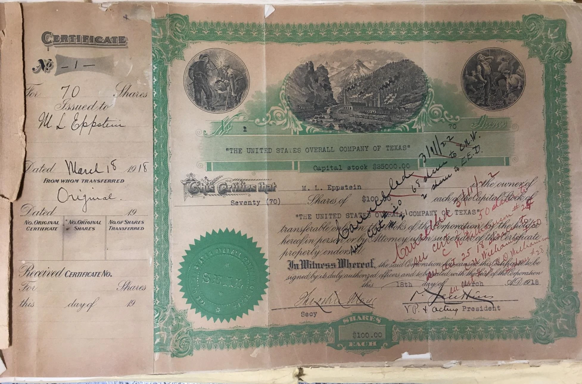1918 年发行的首批股票凭证之一,于 1922 年转让至威廉姆森家族。